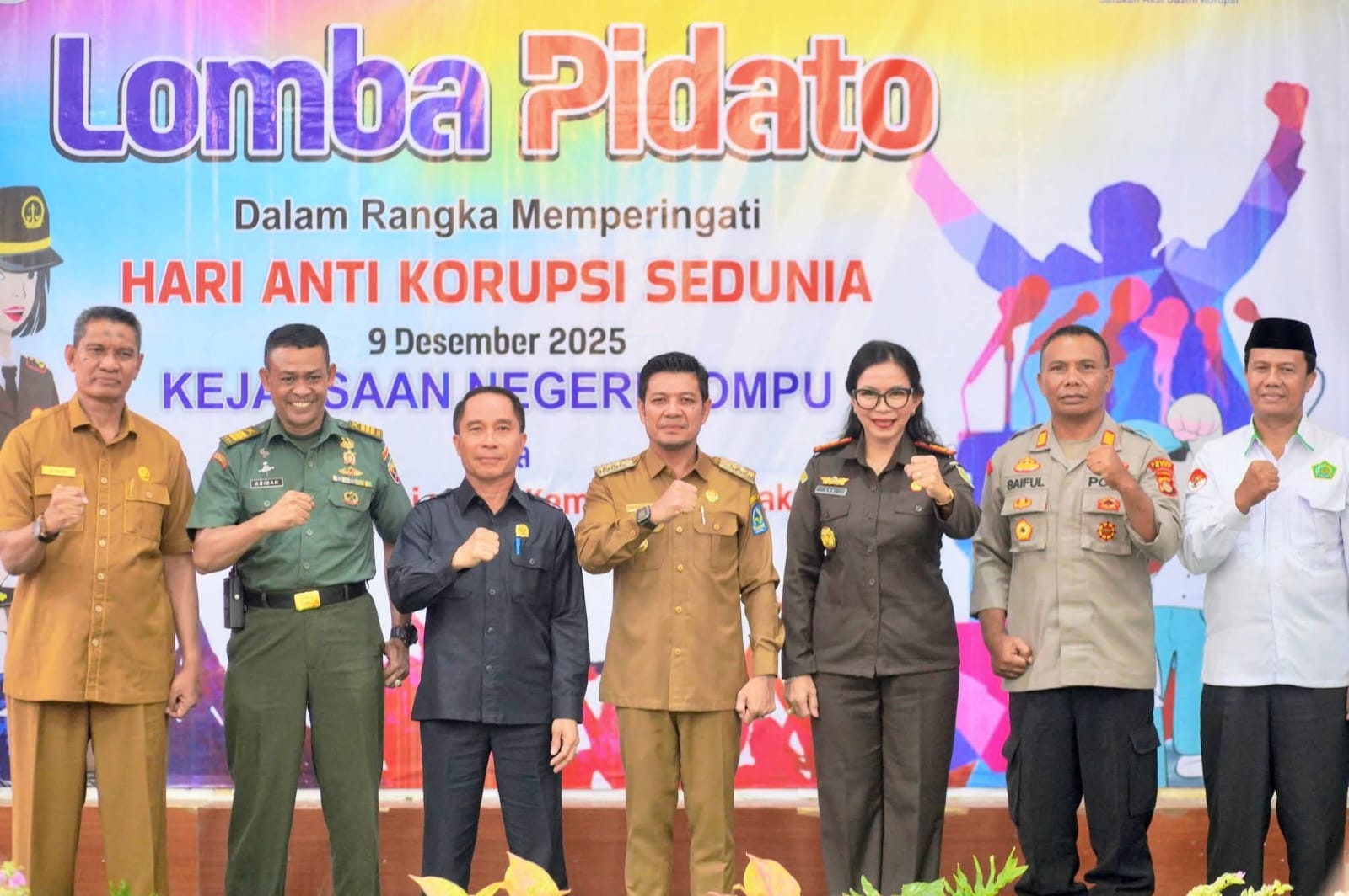 Acara tersebut dipimpin oleh Kajari Dompu, Luciana Bida, S.H., M.H., yang juga menjadi salah satu juri dalam lomba tersebut. Hadir pula Bupati Dompu Bambang Firdaus, SE., yang menekankan pentingnya membangun budaya antikorupsi sejak dini. Kehadiran Kapten Inf Adisan, Pasi Intel Kodim 1614/Dompu, menambah pentingnya sinergi TNI dalam upaya pencegahan dan pemberantasan korupsi di daerah.