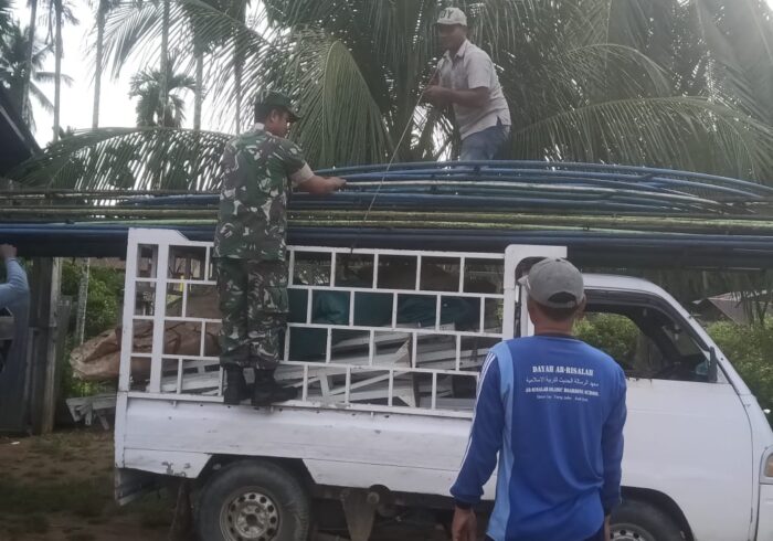 ACEH JAYA – Babinsa Koramil 04/Krueng Sabee, Serma Budiman, melaksanakan kegiatan komunikasi sosial dengan pedagang ayam, salah satunya Dapa (27), di Pasar Ikan Desa Gampong Blang, Kecamatan Krueng Sabee, Jumat (18/04).