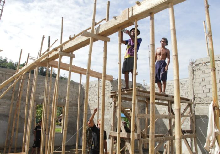 Dengan semangat kebersamaan, anggota TNI dan warga mengangkut bahan material secara manual karena medan yang sulit dilalui kendaraan berat. Proses ini dilakukan dari titik penurunan material menuju lokasi pengecoran.