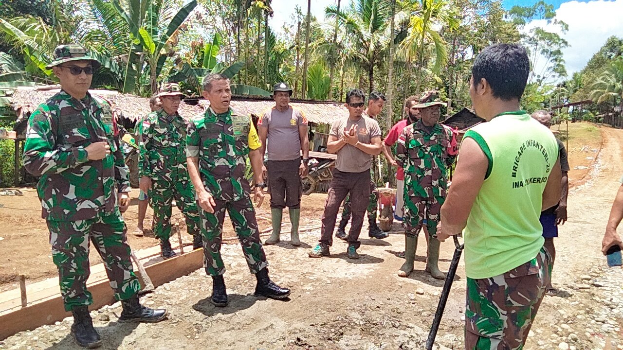 Di tengah teriknya matahari, Tim Wasev turun langsung ke lokasi pengecoran. Kolonel Kav Husnizon tampak berbincang dengan anggota Satgas dan warga yang bergotong royong mengaduk semen, mengangkat batu, serta meratakan coran di badan jalan.