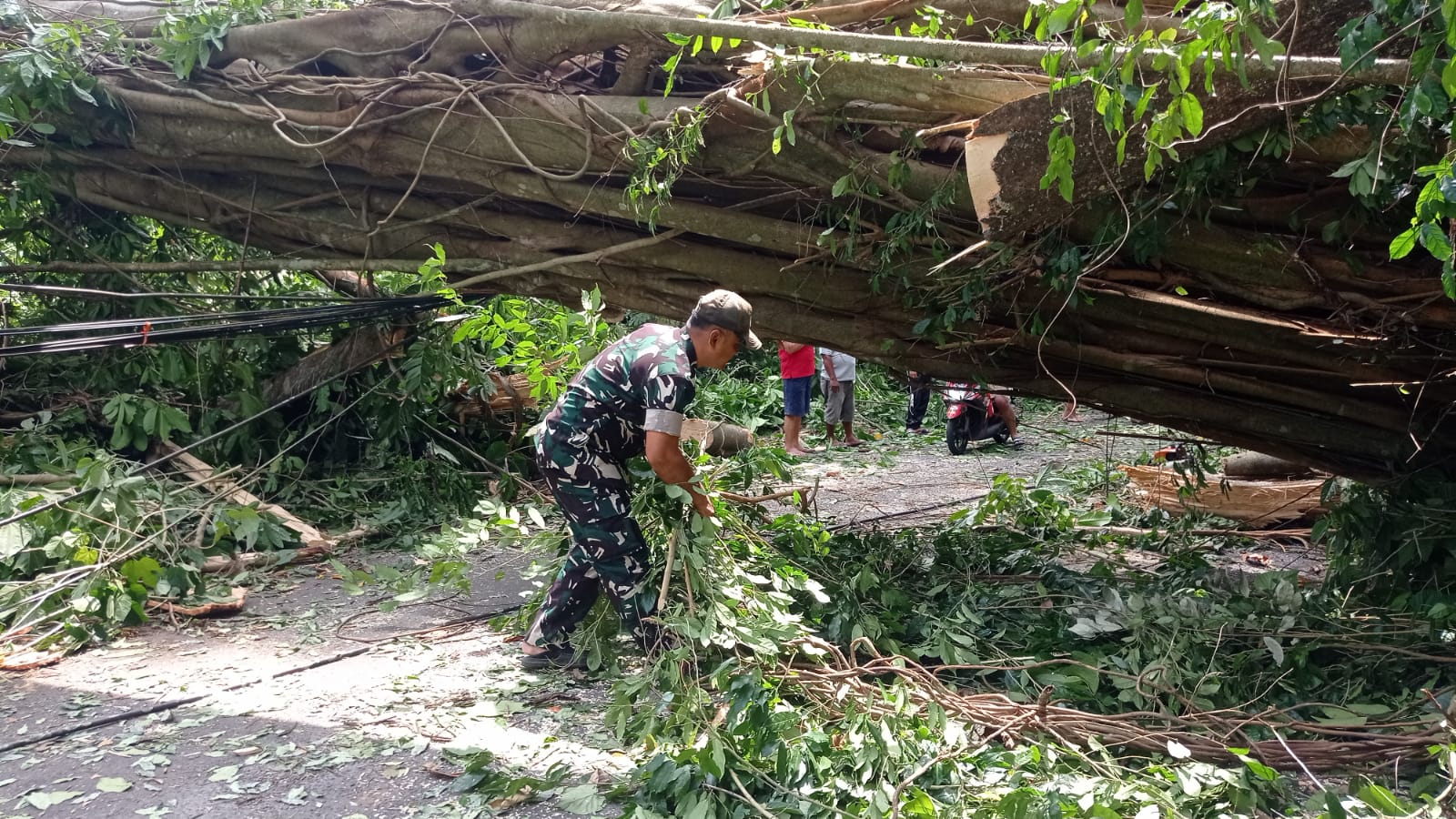 Pohon beringin yang sudah lapuk tumbang dan menimpa tanaman woka (wager), menyebabkan semua lalu lintas terhambat. Kejadian ini tidak hanya membuat arus lalu lintas terganggu, tetapi juga berdampak pada jaringan listrik yang menyebabkan pemadaman di kawasan tersebut.
