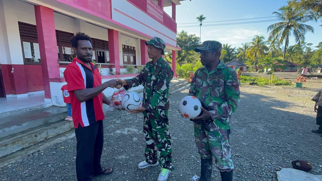 Dalam upaya menumbuhkan semangat dan budaya olahraga di kalangan pelajar, Satgas TMMD ke-124 Kodim 1710/Mimika memberikan bantuan bola kaki kepada siswa-siswi di SD Pigapu. Jumat (23/5/2025).