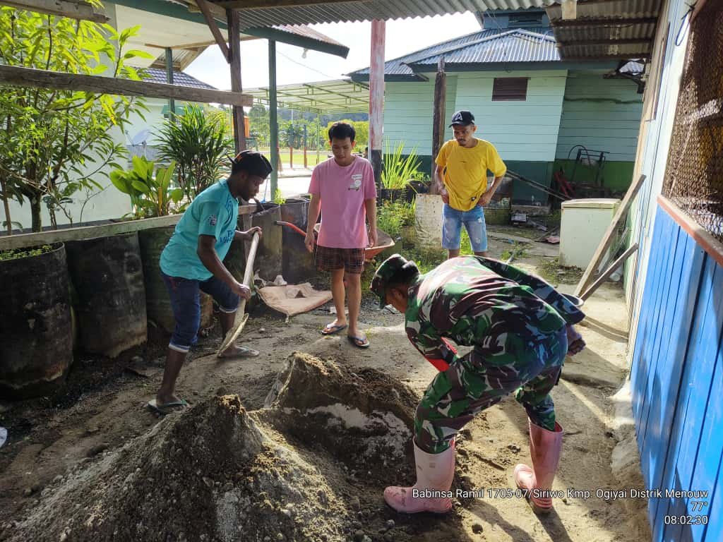 Siriwo – Anggota Koramil 1705-07/Siriwo Srm. Laode Insani bersama warga masyarakat Desa Unipo melaksanakan Karya Bhakti membantu warga mengecor lantai rumah di Desa Unipo, Distrik Siriwo, Kabupaten Nabire, Provinsi Papua Tengah.