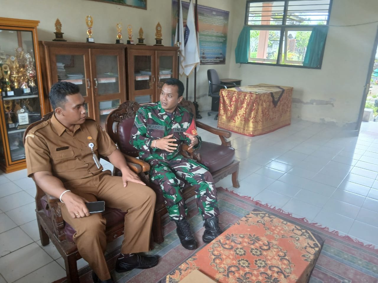 Disambut hangat oleh Kepala Sekolah SD 1 Timuhun bapak I Dewa Gede Sudharmanta,S.Pd,M.Pd, suasana akrabpun terlihat jelas mewarnai perbincangan Serda I Kadek bersama Kepsek.
