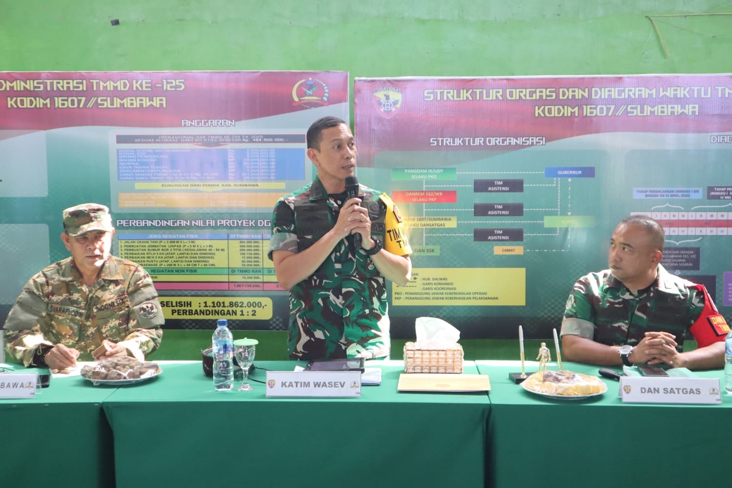 NTB – Sumbawa, Kamis (14/8/2025) — Dalam kunjungan Tim Wasev TNI Manunggal Membangun Desa (TMMD) ke-125 Kodim 1607/Sumbawa, Ketua Tim Wasev Asisten Operasi Kepala Staf Angkatan Darat (Asops KASAD) Mayjen TNI Christian K. Tehuteru memberikan paparan di Balai Desa Kalabeso.
