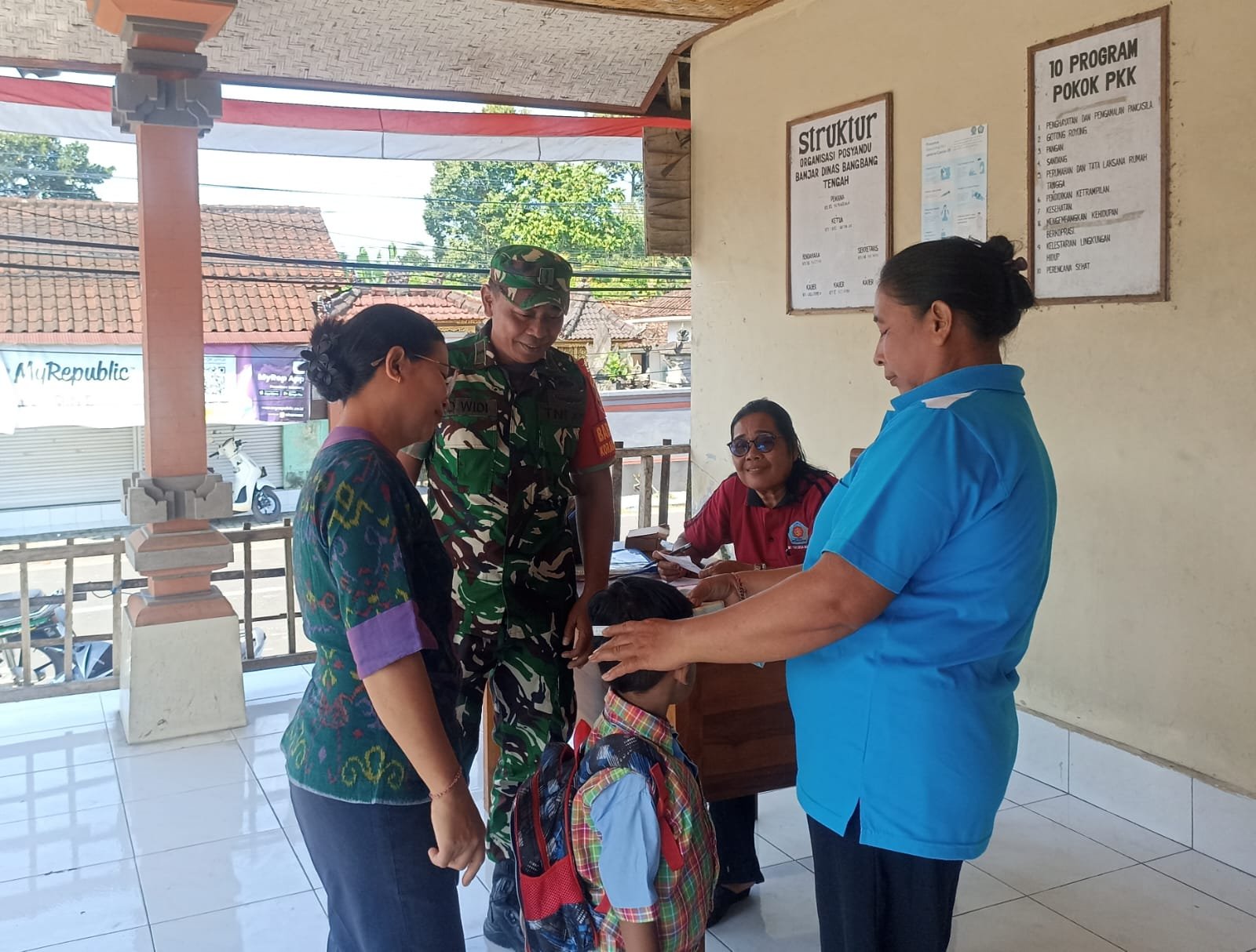 Bangli – Babinsa Desa Bangbang Koramil 1626-03/Tembuku, Pelda Kadek Widiarta, melaksanakan kegiatan pendampingan dan pemantauan Posyandu Balita yang diselenggarakan oleh Puskesmas Pembantu Desa Bangbang bersama kader Posyandu Cempaka Banjar Dinas Bangbang Kangin.