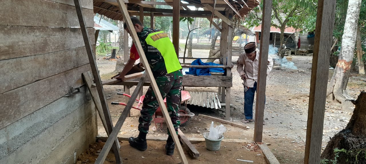 Pada kesempatan tersebut Sertu Iwan Palentino turun langsung ke lokasi untuk membantu proses pembangunan rumah yang tengah berlangsung. Selain memberikan bantuan tenaga, Babinsa juga turut memberikan arahan terkait teknik pembangunan yang baik dan aman.