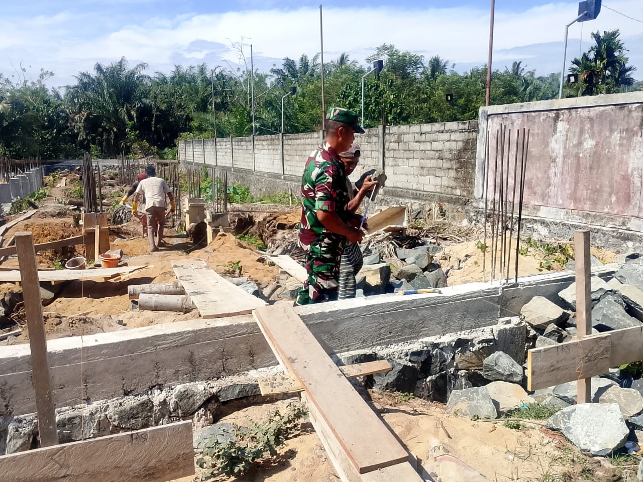 Dalam kegiatan tersebut, Babinsa ikut langsung memasang batu pondasi untuk pembangunan lapangan voli di desa setempat. Kehadiran Babinsa di lapangan menunjukkan kepedulian TNI terhadap masyarakat sekaligus mempererat tali silaturahmi dengan warga binaan.