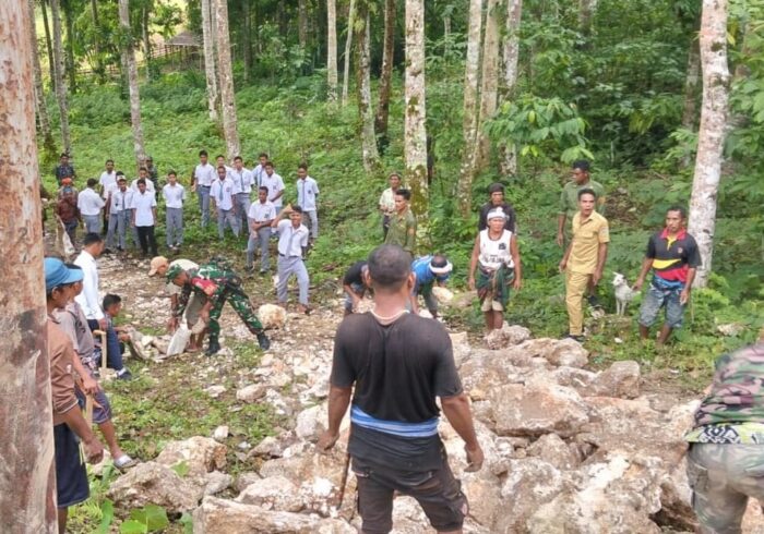 Babinsa Bersama Pemdes Apuan Gotong Royong Perbaiki Jalan Rusak