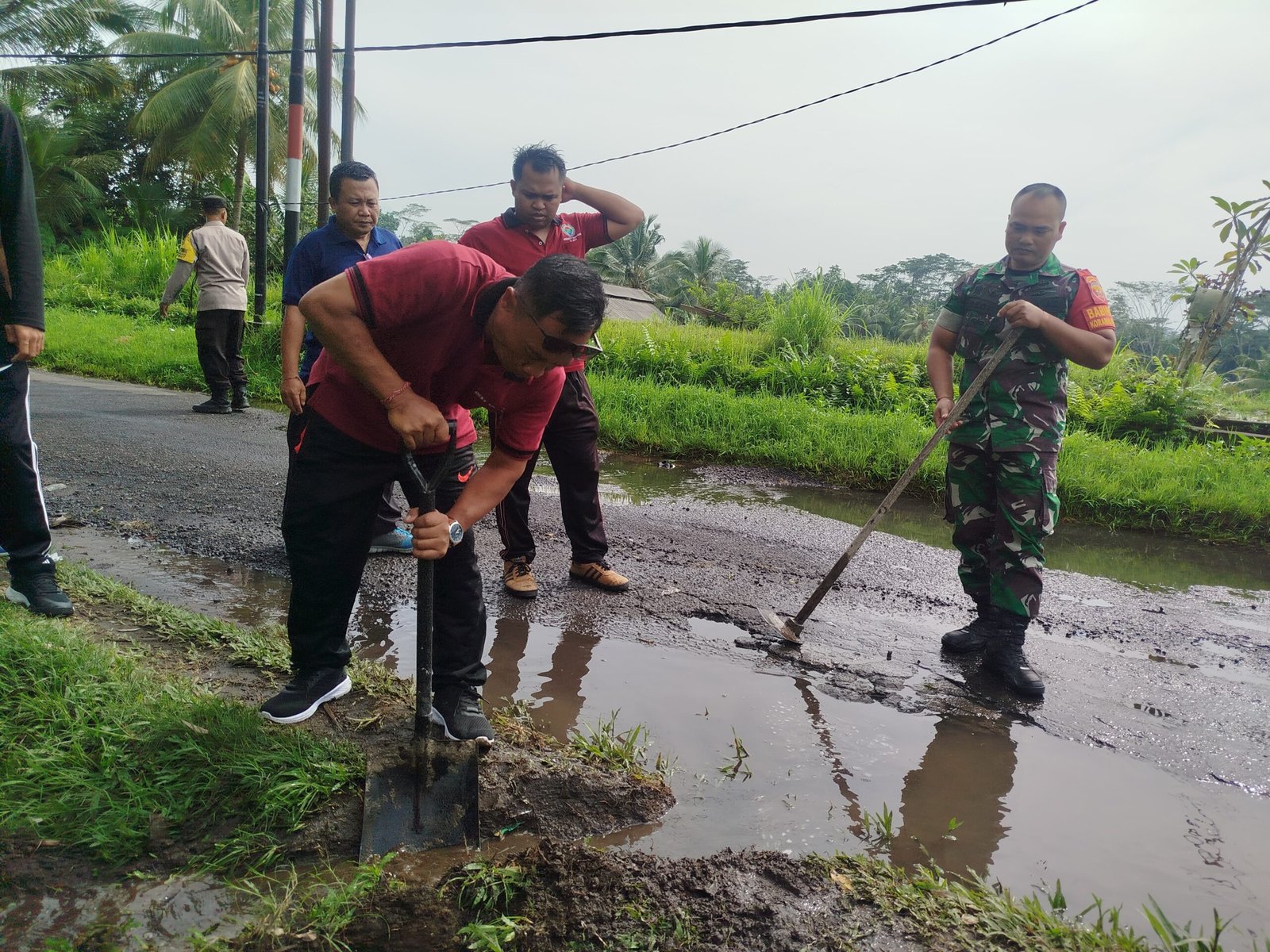 Bangli – Babinsa Koramil 1626-02/Susut Kodim 1626/Bangli Serka Ketut Rediada melaksanakan gotong royong bersama Pemerintah Desa Apuan memperbaiki jalan yang rusak diwilayah Banjar Apuan Kelod, Desa Apuan, kecamatan Susut, Kabupaten Bangli, Jumat (17/01/25).