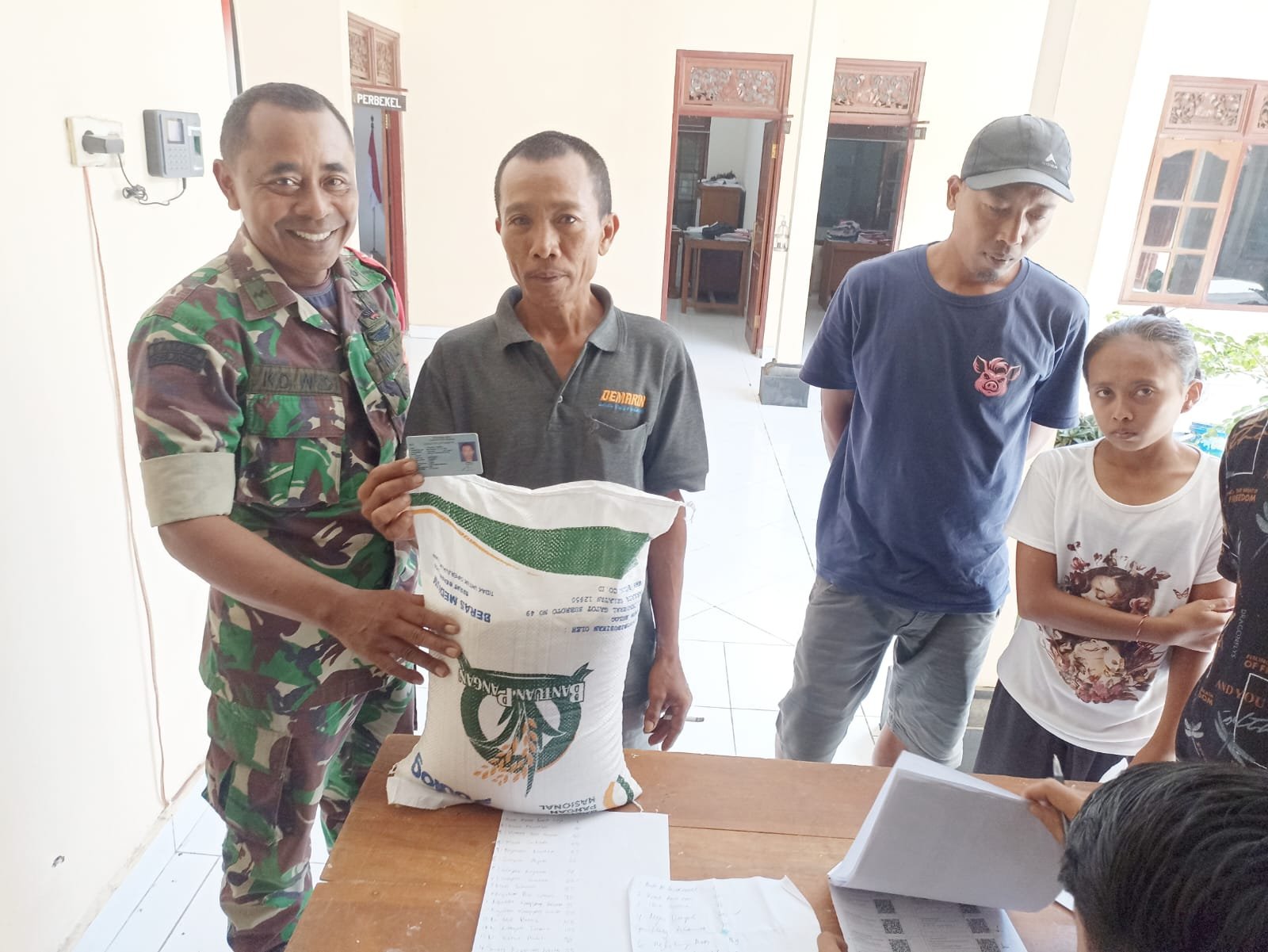 “Kehadiran kami selaku Babinsa pada kegiatan tersebut dalam rangka memastikan bahwasanya penyaluran bantuan berupa beras ini memang sesuai dengan data yang ada serta tepat sasaran” Ujarnya