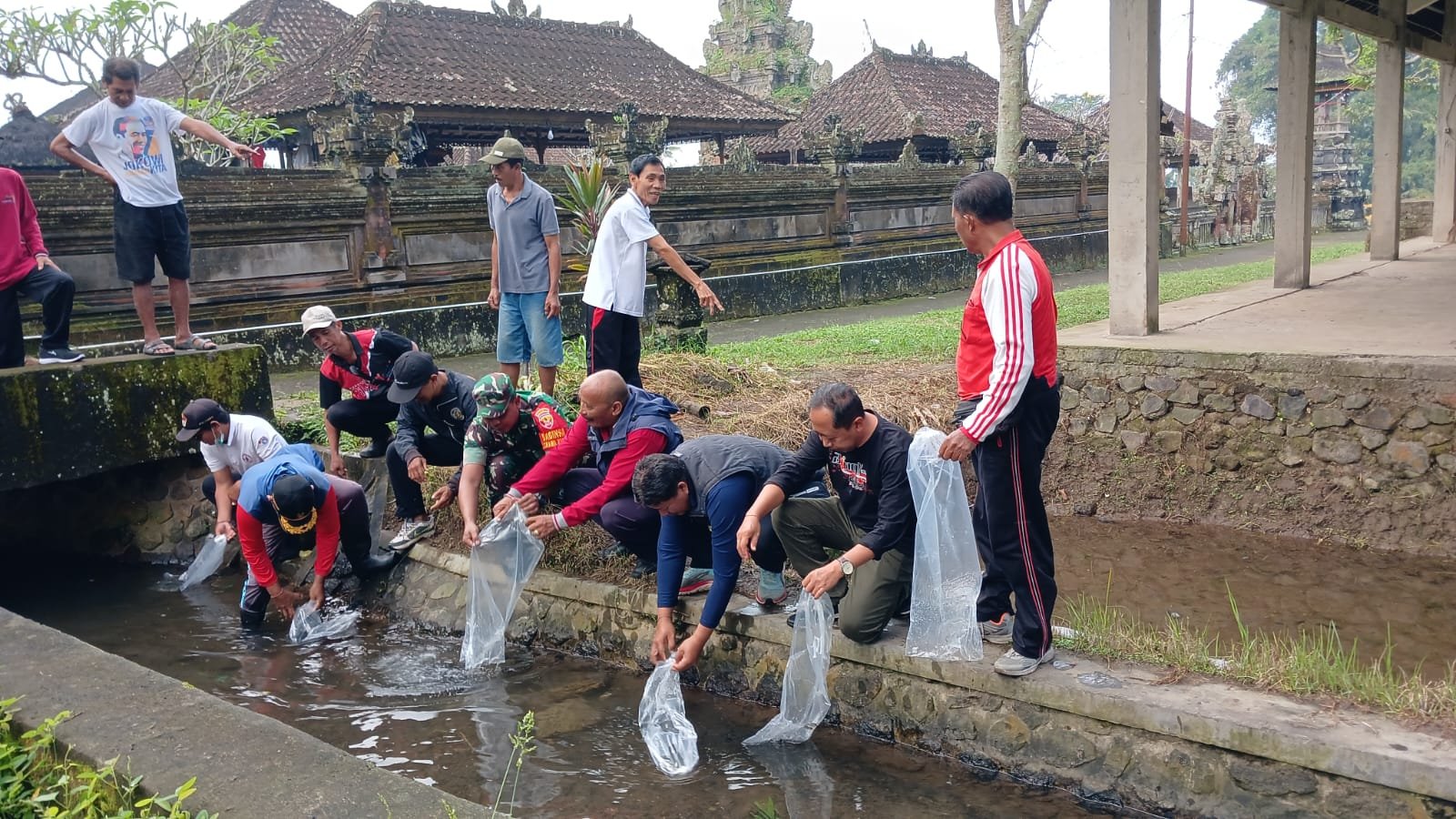 Bangli – Dalam rangka mengembalikan ekosistem di perairan umum serta sebagai bahan pangan Babinsa Desa Bangbang Koramil 1626-03/Tembuku Pelda Kadek Widiarta menghadiri kegiatan penebaran ikan di perairan umum (restocking) bertempat di Saluran Irigasi Subak Bangbang Let Desa Bangbang Kecamatan Tembuku, Kabupaten Bangli. jumat (23/05/25)