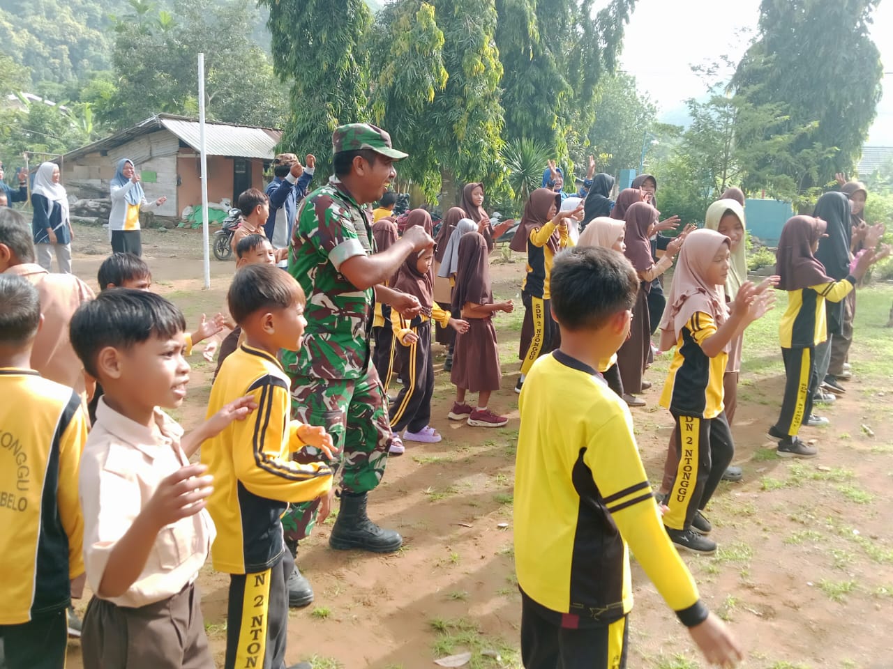 Kabupaten Bima – Pada Sabtu, 17 Januari 2026, Babinsa Desa Ntonggu dari Koramil jajaran Kodim 1608/Bima melaksanakan kegiatan senam ceria yang dihadiri oleh para siswa SDN 02 Ntonggu. Acara ini digelar sebagai upaya untuk membantu proses trauma healing akibat penyegelan sekolah yang dilakukan oleh oknum masyarakat baru-baru ini.