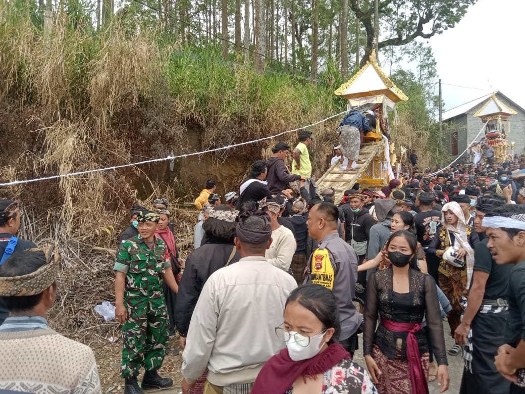 Bangli – Babinsa Desa Sukawana, Serka Dewa Nyoman Alit Adnyana Putra, bersama Bhabinkamtibmas Desa Sukawana, Aipda I Nyoman Warjana, serta pecalang adat setempat melaksanakan kegiatan pengamanan dan pemantauan jalannya Upacara Ngaben Masal (Pitra Yadnya) di Setra Adat Sukawana, Kecamatan Kintamani, Kabupaten Bangli.Sabtu kemarin (09/08/25)