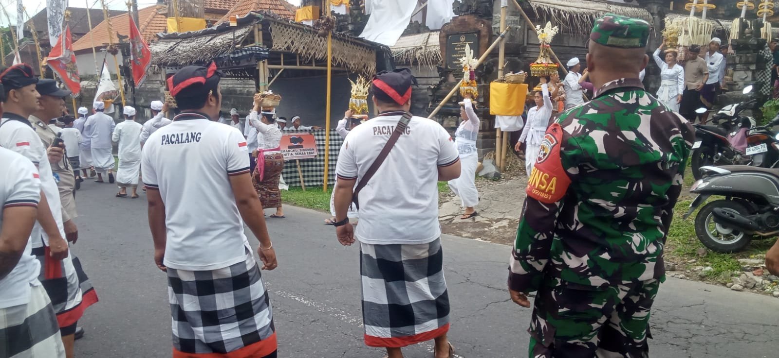 Bangli – Babinsa Desa Sulahan Koptu I Made Sukadana bersama Bhabinkamtibmas Desa Sulahan Aiptu I Wayan Sukayasa melaksanakan kegiatan pemantauan dan pengamanan upacara keagamaan Mapepade Agung yang bertempat di Pura Puseh Banjar Adat Desa Tanggahan Peken, Desa Sulahan, Kecamatan Susut, Kabupaten Bangli. Selasa (4/11/2025)
