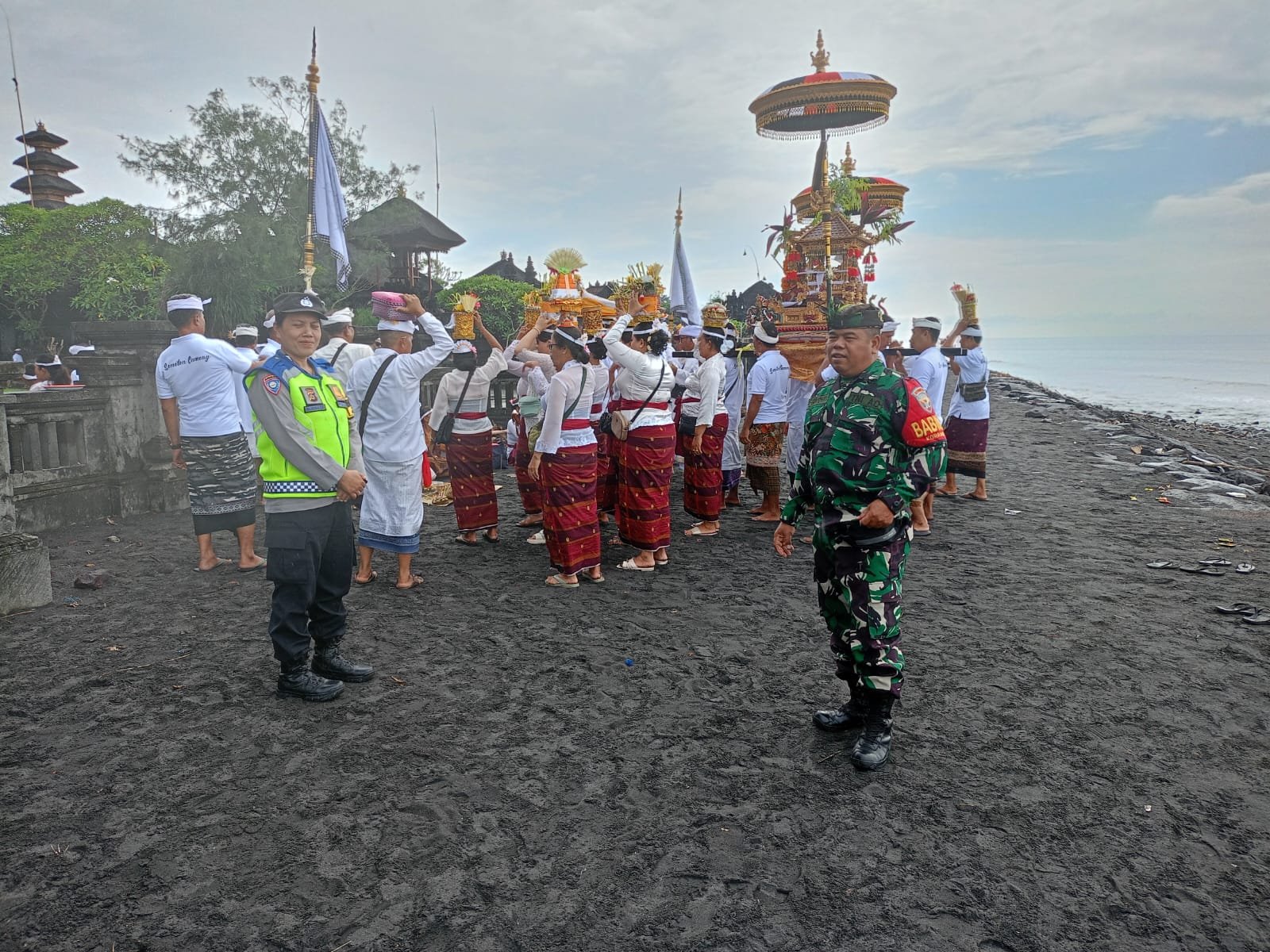 Klungkung, – Guna memberikan keamanan, kenyamanan dan kelancaran kegiatan keagamaan melasti warga Dusun Anjingan, Desa Getakan Kecamatan Banjarangkan, Babinsa Getakan Serma Wayan Sukadana melaksanakan pengawalan dan pengamanan.