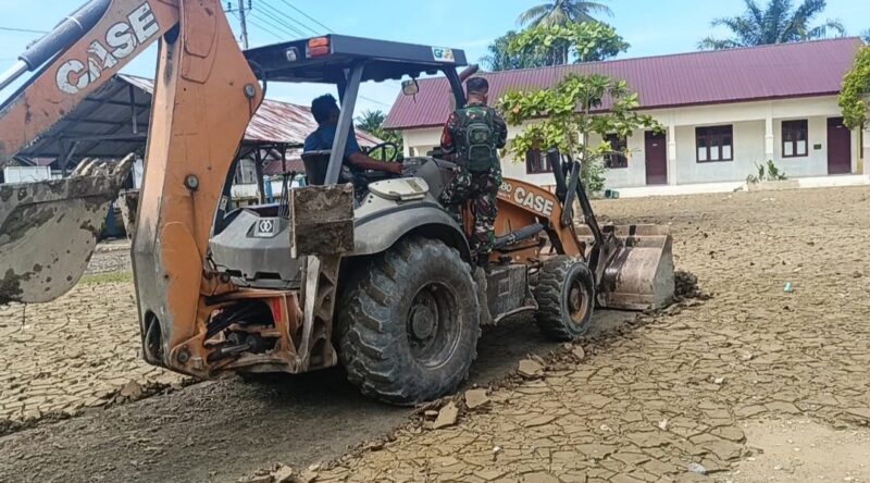 “Untuk hari ini kita bersama unsur terkait melaksanakan atau melakukan pembersihan lumpur sisa-sisa banjir yang ada di halaman sekolah dan akan kita angkut untuk di buang” Ujar Serka Fuad.