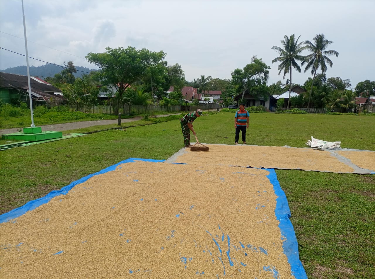 ACEH JAYA – Dalam rangka meningkatkan kemanunggalan TNI dengan rakyat serta memberikan dukungan nyata bagi sektor pertanian, Babinsa Koramil 01/Jaya, Kopral Satu (Koptu) Aris Kartiko, secara aktif turun langsung ke lapangan untuk membantu warga binaannya. Kali ini, Koptu Aris Kartiko memberikan kontribusi berarti dengan membantu Bapak Sanusi, seorang petani di Desa Meunasah Weh, Kecamatan Jaya, dalam proses menjemur padi, Senin (25/08).