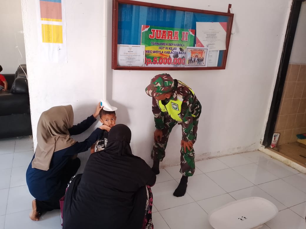ACEH BARAT – Bintara Pembina Desa (Babinsa) Koramil 02/Woyla, Serda Didi Suhairi, melaksanakan kegiatan pendampingan Pos Pelayanan Terpadu (Posyandu) di Kantor Desa Blang Mee, Kecamatan Woyla, Kabupaten Aceh Barat, Kamis (06/11/2025).