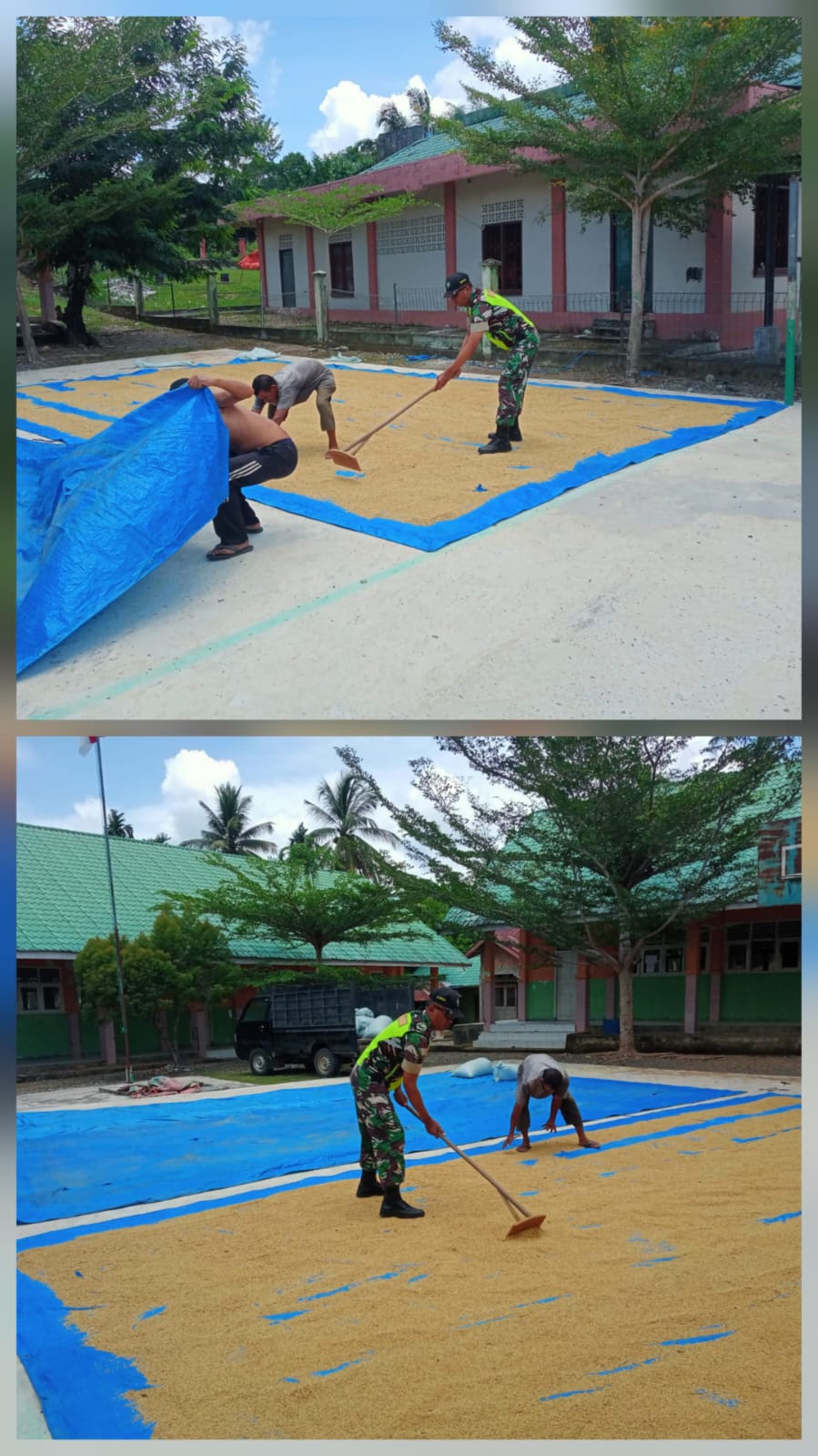 Hampir seluruh petani di wilayah Woyla sudah mulai panen. Terlihat Sertu M. Dahlan ikut menjemur padi mereka yang sudah dipanen untuk menjaga mutu padi agar tetap terjaga dengan baik pascapanen.