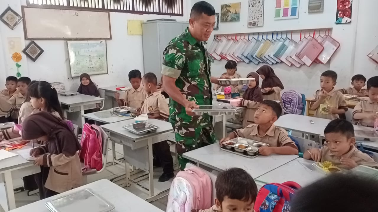 ACEH BARAT – Sertu Agustino, Babinsa Koramil 07/Johan Pahlawan Kodim 0105/Aceh Barat, melaksanakan pemantauan kegiatan pemberian makan bergizi gratis kepada siswa-siswi Sekolah Dasar Negeri (SDN) 14 yang berlokasi di Jalan Manek Roo, Desa Ujung Baroh, Kecamatan Johan Pahlawan, Kabupaten Aceh Barat, Jumat (10/10/2025).