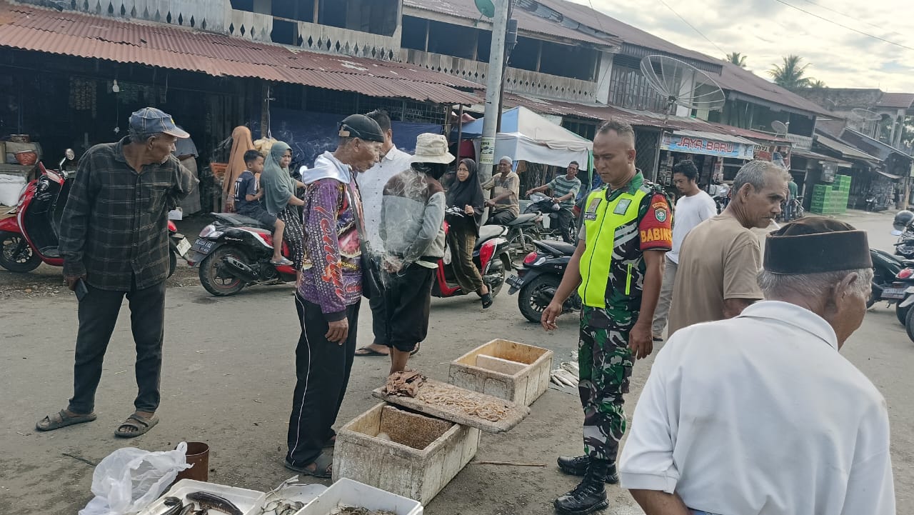 ACEH BARAT – Babinsa Koramil 08/Arongan Lambalek Kodim 0105/Abar, Koptu Adi Diarto, melaksanakan kegiatan komunikasi sosial (komsos) dengan masyarakat sambil memantau harga bahan kebutuhan pokok (ikan) di pasar tradisional Desa Teupin Peuraho, Kecamatan Arongan Lambalek, Kabupaten Aceh Barat, Kamis (03/07/2025).