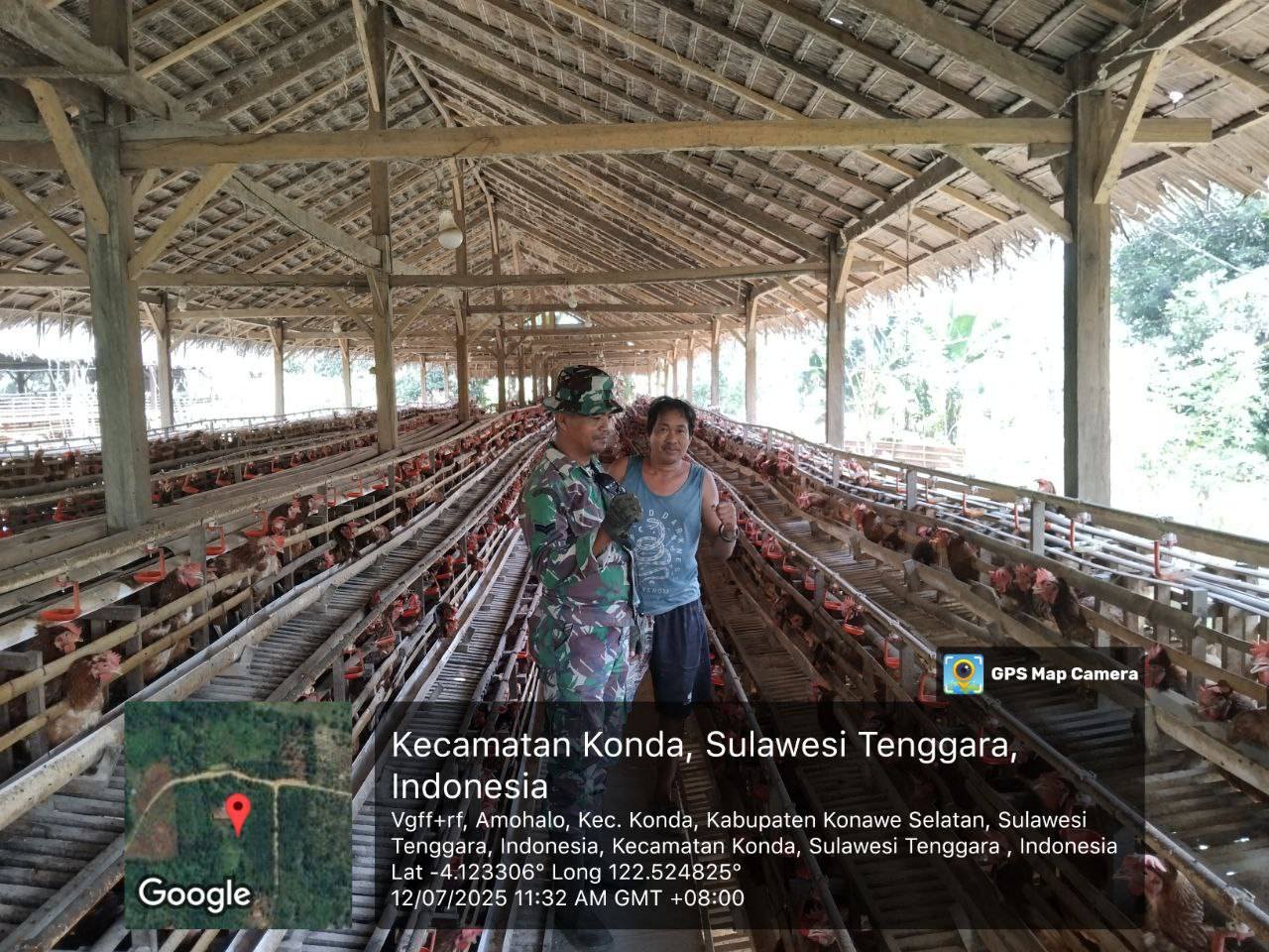 Dalam upaya mendukung ketahanan pangan dan peningkatan ekonomi masyarakat, Babinsa Koramil 1417-09/Ranomeeto Kodim 1417/Kendari, Sertu Wilfret, melaksanakan pemantauan di peternakan ayam petelur milik warga binaan di Desa Amohalo, Kecamatan Konda, Kabupaten Konawe Selatan, pada Sabtu (12/7).
