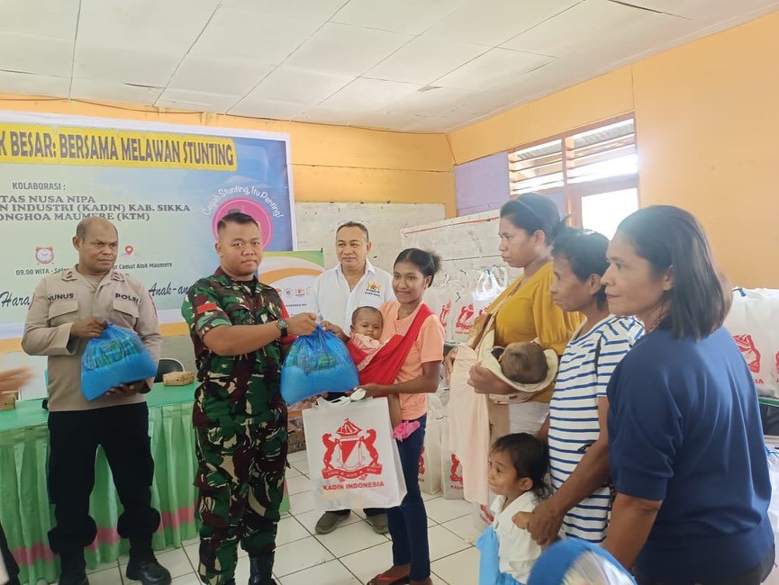 NTT-SIKKA. Pemerintahan Kecamatan Alok, berkolaborasi dengan Universitas Nusa Nipa Indonesia, Kamar Dagang dan Industri (KADIN) Kabupaten Sikka dan Komunitas Tionghoa Maumere (KTM) memberikan Bantuan Makanan Tambahan dan Sembako kepada 186 Orang Tua bayi/balita Stunting di wilayah Kecamatan Alok, Kabupaten Sikka, Senin 23/12/24.