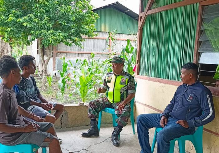Babinsa Koramil 01/Kota So’e Sertu Hengki Sodak jajaran Kodim 1621 TTS melaksanakan kegiatan komunikasi sosial (komsos) dengan warga binaannya di Kelurahan Cendana, Kecamatan Kota So’e Kabupaten TTS, Jum’at (27/12/2024).