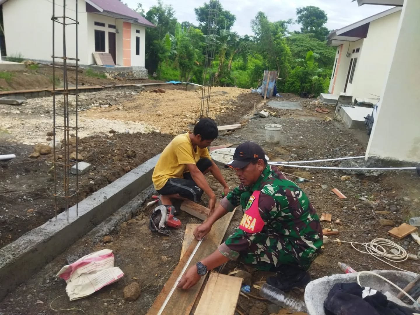 Babinsa Koramil 1801-01/Manokwari serda Rusiadin menunjukan kepedulian sosialnya kepada warga binaan nya dengan bergotong royong meringankan beban warga nya membantu pembuatan pondasi pagar rumah milik bapak Marsel warga di Kampung Transad Kelurahan Anday Distrik Manokwari selatan, Kabupaten Manokwari., Provinsi Papua Barat, Kamis (23/01/2025).