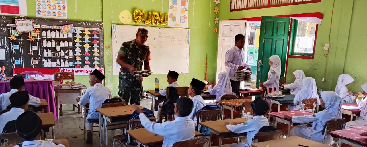 ACEH JAYA – Babinsa Koramil 01/Jaya Kodim 0114/Aceh Jaya, Praka Muh Arsyad, melaksanakan pemantauan pendistribusian makanan bergizi yang disalurkan oleh Tim SPPG Yayasan Kurnia Jaya Abadi kepada para siswa di MIN Negeri 1 Jaya, Desa Pante Keutapang, Kecamatan Jaya, Kabupaten Aceh Jaya, Kamis (08/01/2026).
