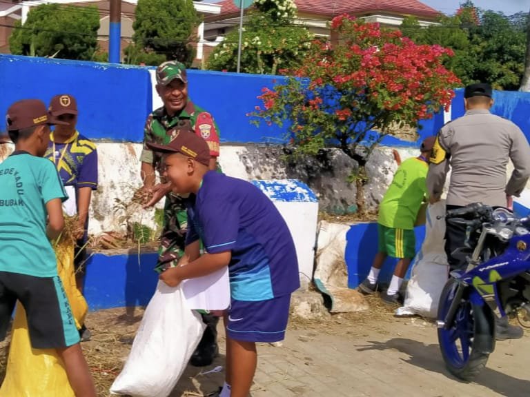 SUMBA BARAT – Sebagai bentuk kepedulian terhadap kebersihan lingkungan dan pembentukan karakter generasi muda, Babinsa Koramil 1613-01/Loli, Sertu Silas Kikhau, bersama Bhabinkamtibmas dan siswa-siswi SMP Kristen Waikabubak melaksanakan kegiatan pembersihan sampah plastik di Lapangan Manda Elu, Kelurahan Komerda, Kecamatan Kota Waikabubak, Kabupaten Sumba Barat, Sabtu (19/7/2025).