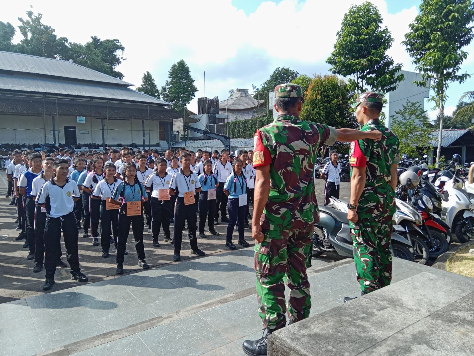Gianyar – Ubud, Selasa (22/7/2025) — Dalam upaya menanamkan nilai-nilai cinta tanah air dan disiplin sejak dini, Babinsa Koramil 1616-02/Ubud melaksanakan pembinaan wawasan kebangsaan (Wasbang) dan bela negara kepada siswa-siswi SMAN 1 Ubud. Kegiatan yang berlangsung di lingkungan sekolah SMAN 1 Ubud, Lingkungan Samban, Kelurahan Ubud, Kecamatan Ubud, ini dipimpin langsung oleh Bati Tuud Koramil 1616-02/Ubud, Peltu Ida Bagus Didi Kusuma, bersama anggota Koramil lainnya.