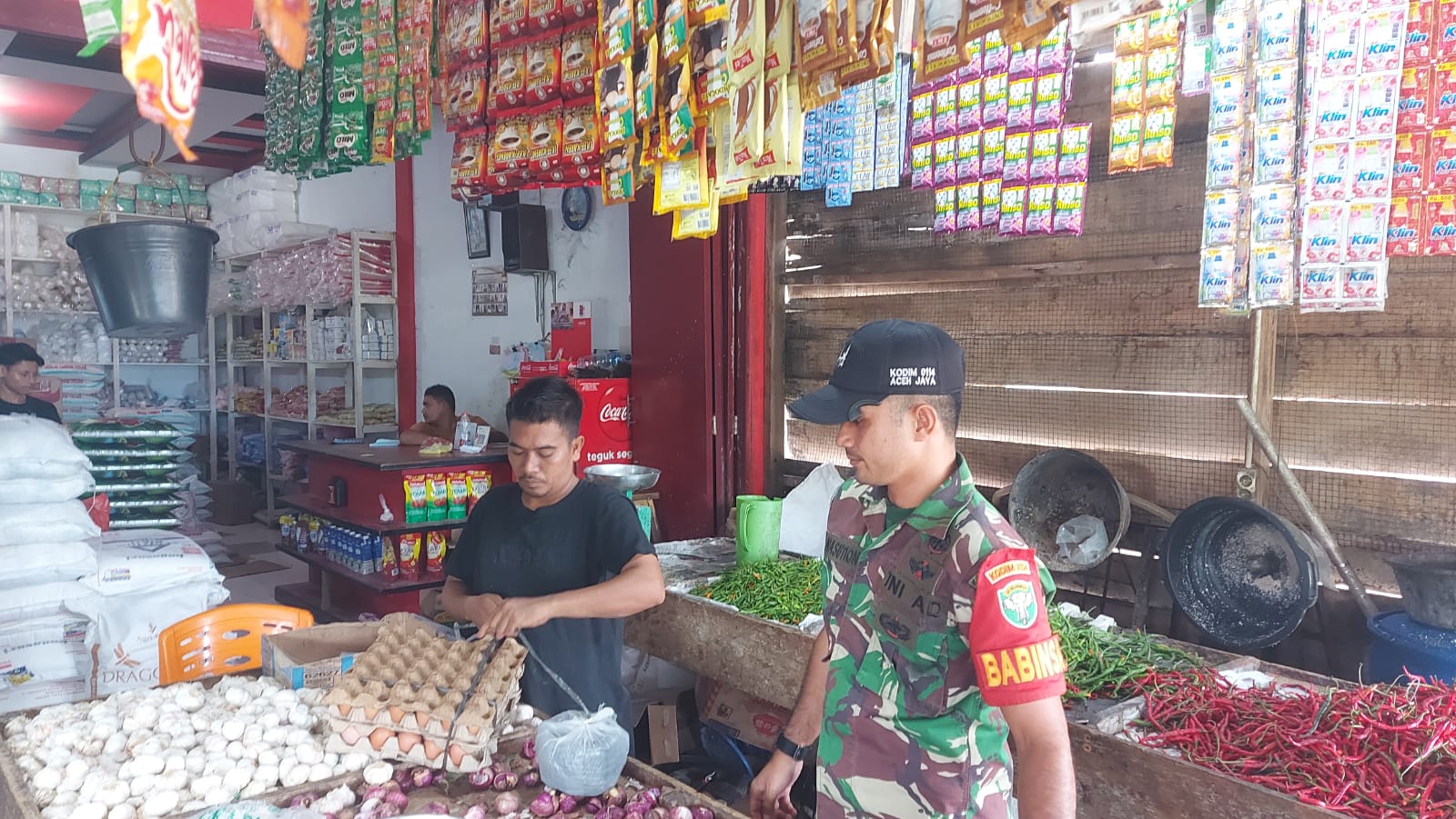 Aceh Jaya – Dalam rangka menjaga stabilitas harga bahan pokok dan mempererat hubungan dengan masyarakat, Babinsa Koramil 04/Krueng Sabee Kodim 0114/Aceh Jaya, Prajurit Satu (Pratu) Rudi Batari, melaksanakan kegiatan komunikasi sosial (komsos) sekaligus memantau perkembangan harga sembako di pasar tradisional.