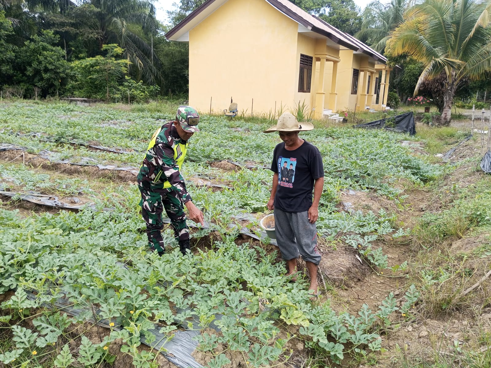 ACEH BARAT – Sebagai kepedulian terhadap petani, Babinsa Posramil 06/Bubon, Kodim 0105/Aceh Barat, Serda Endi membantu warga mengecek pertumbuhan tanaman semangka di Desa Alue Lhok, Kecamatan Bubon, Kabupaten Aceh Barat, Jumat (22/08/2025).