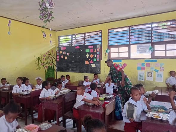 Yapen – Untuk mendukung kelancaran program Makan Bergizi Gratis (MBG), Babinsa dari Koramil 1709-01/Serui, Serka Tahir Karubaba, melaksanakan pemantauan dan pendampingan di beberapa sekolah yang terletak di Distrik Angkaisera, Kabupaten Kepulauan Yapen pada Senin (08/02/2026).