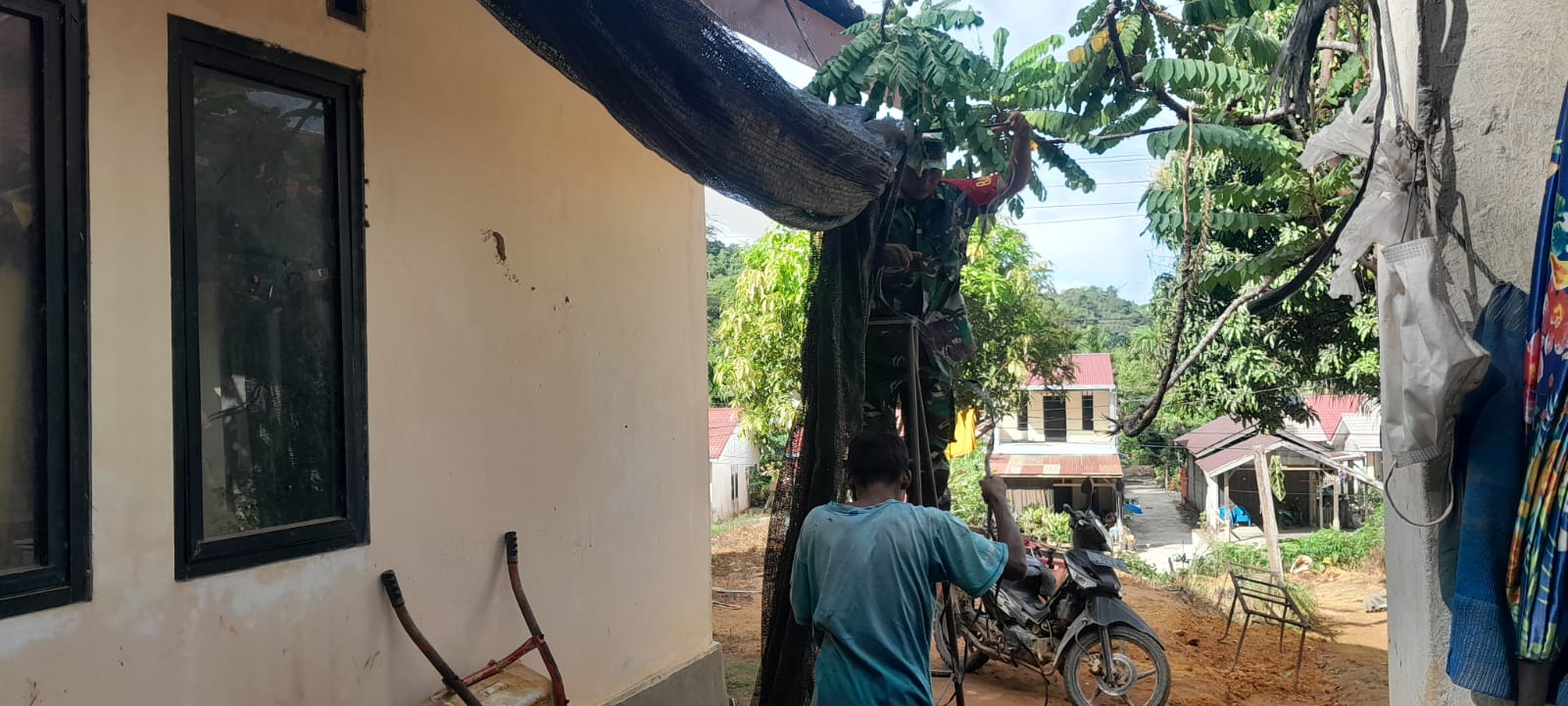 Di rumah Bapak Adi, Kopda Gito bersama warga sekitar bergotong royong memasang atap pelindung panas. Atap tersebut dipasang sebagai tambahan untuk mengurangi teriknya matahari yang masuk ke dalam rumah, sehingga penghuni rumah dapat merasakan kenyamanan yang lebih baik dalam beraktivitas sehari-hari.