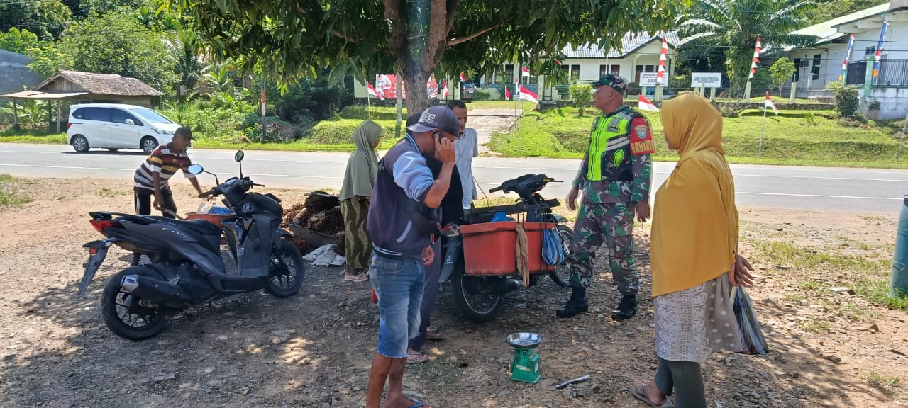 ACEH JAYA – Babinsa Koramil 03 Setia Bakti, Serda Ferial Suzanto, secara aktif melaksanakan kegiatan Komunikasi Sosial (Komsos) dengan para pedagang ikan di Desa Lhok Geulumpang, Kecamatan Setia Bakti, Kabupaten Aceh Jaya. Kegiatan yang dilaksanakan pada Rabu (06/08), ini bertujuan untuk memantau dan menggali informasi terkini mengenai perkembangan penjualan ikan di tingkat lokal, serta memastikan ketersediaan pasokan yang memadai bagi masyarakat desa.