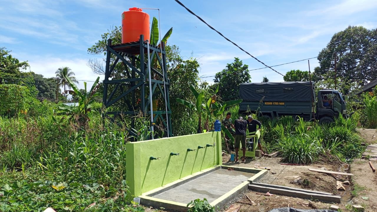 Pembangunan sumur bor di Kampung Manunggal Jaya, Distrik Makimi, kini memasuki tahap akhir. Satgas TMMD ke-125 Kodim 1705/Nabire memastikan bak penampungan air dan titik kran air sudah dipasang rapi serta siap digunakan masyarakat.