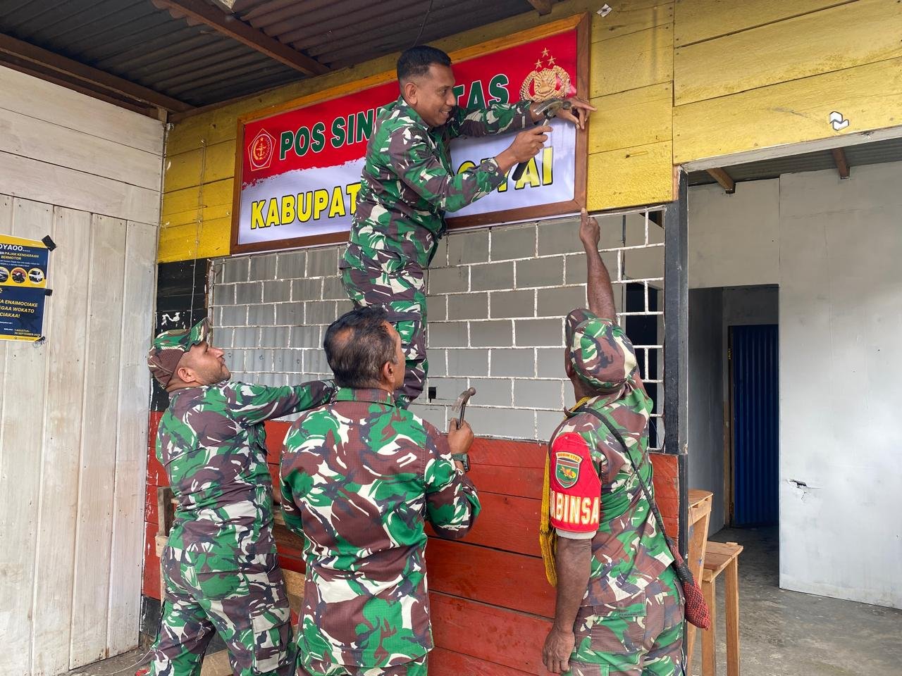 Moanemani ~ Dalam rangka memperkuat kerja sama antara TNI, Polri, dan masyarakat, Babinsa Koramil 1705-02/Moanemani melaksanakan pemasangan spanduk Pos Sinergitas di wilayah binaannya yang terletak di Kampung Ikebo Distrik Moanemani, Kabupaten Dogiyai, Papua Tengah.