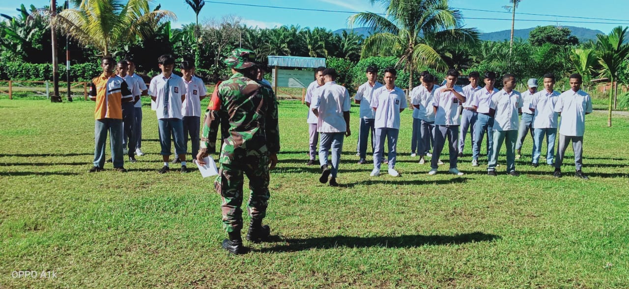 MANOKWARI – Babinsa Koramil 1801-06/Sidey Sertu Hendrigu memberikan pelatihan PBB (Peraturan Baris Berbaris) dan pembekalan Wawasan kebangsaan kepada siswa/siswi di lapangan dan Aula SMK Negeri 5 Sidey, Kabupaten Manokwari, Provinsi Papua Barat, Kamis (16/01/2025).
