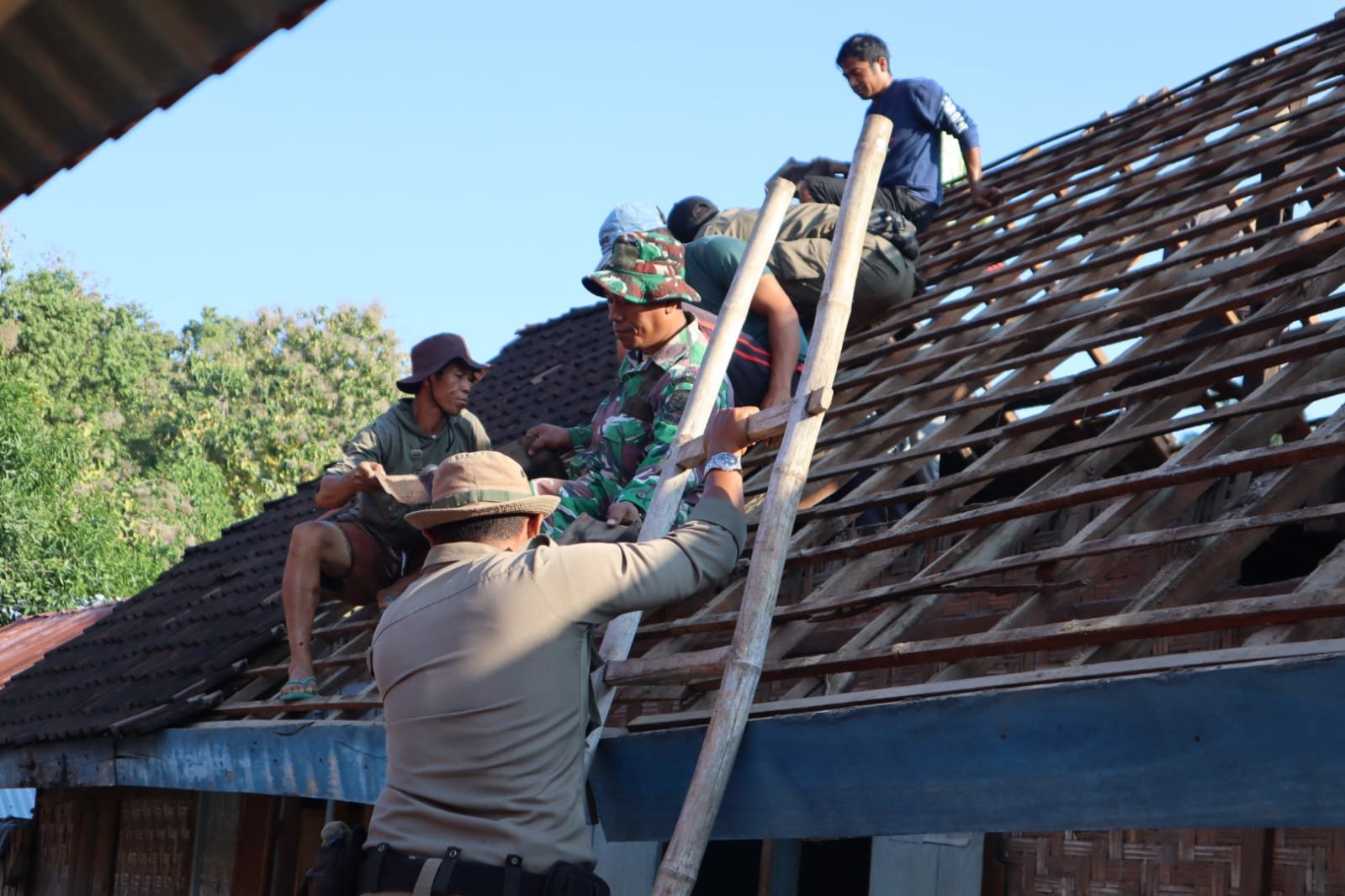 Warga sekitar pun turut ambil bagian dalam proses perbaikan rumah. Gotong royong ini menjadi wujud nyata dari semangat kebersamaan.