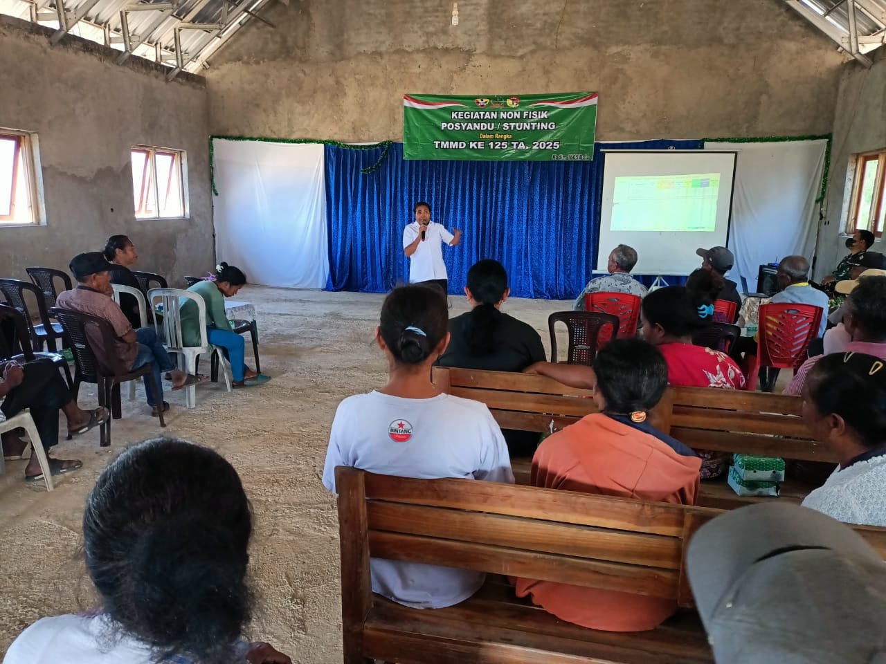 Belu – Guna meningkatkan kesadaran masyarakat akan bahaya stunting dan pentingnya peran Posyandu, Satgas TMMD ke-125 Kodim 1605/Belu bersama Dinas Kesehatan Kabupaten Belu mengadakan penyuluhan kesehatan di Gedung Gereja GBI Marantha, Dusun Mauulun, Desa Naekasa, Kecamatan Tasifeto Barat, Kamis (14/8/2025). Kegiatan ini menjadi bagian dari sasaran non fisik TMMD untuk membangun kapasitas masyarakat di bidang kesehatan.