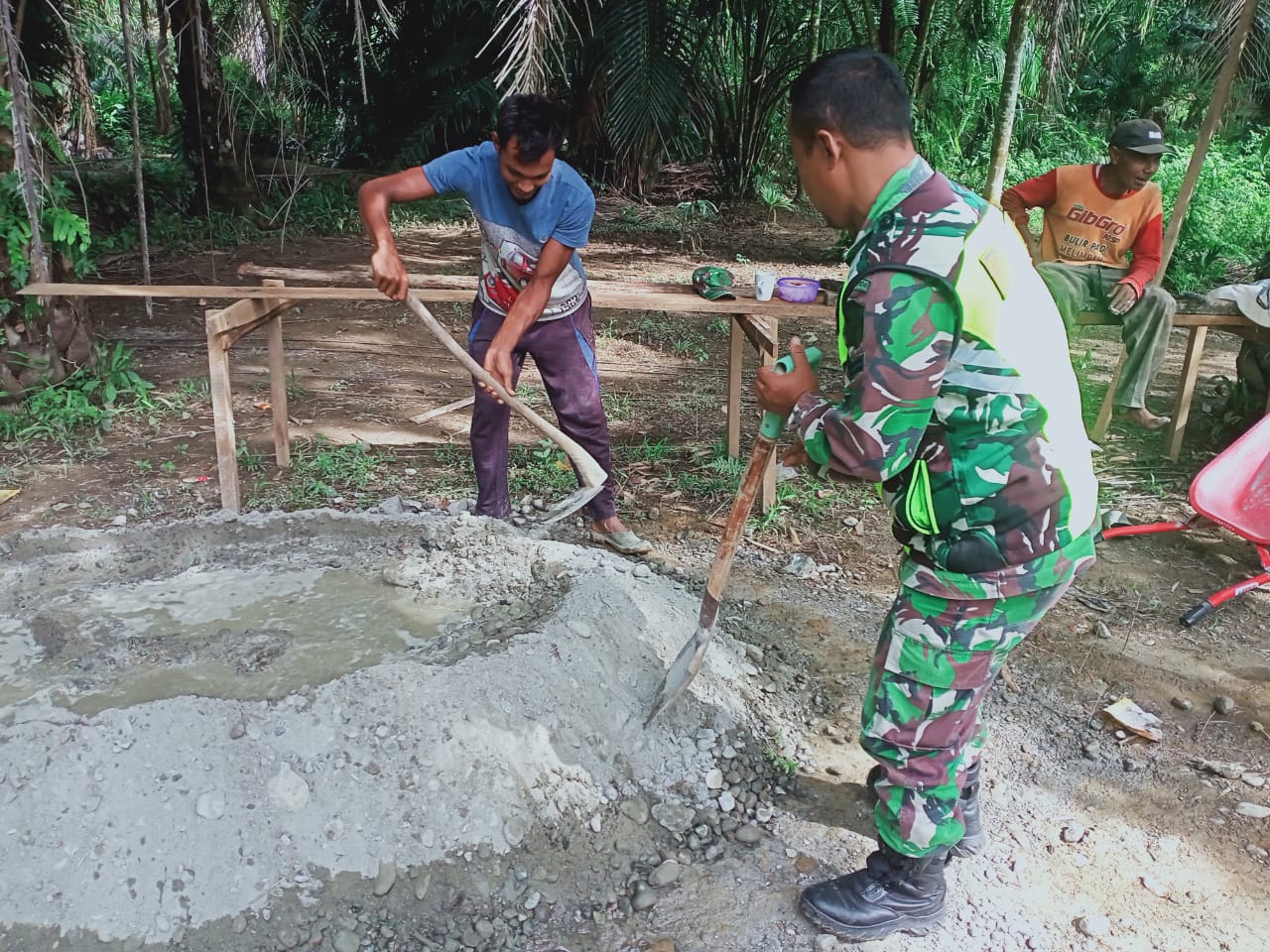 Pada kesempatan tersebut, Babinsa terjun langsung membantu pemasangan mal (cetakan) rumah milik salah satu warga binaannya. Kegiatan ini menjadi bukti nyata kehadiran TNI di tengah masyarakat sekaligus mempererat tali silaturahmi antara Babinsa dan warga.