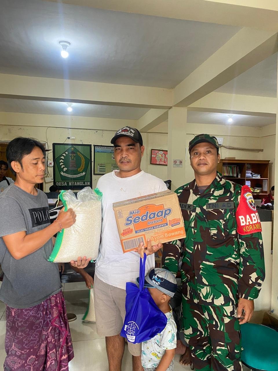 Klungkung,- Babinsa Nyanglan Koramil 1610-02/Banjarangkan Serda Kadek Dwi Awan melaksanakan pendampingan kegiatan penyaluran bantuan Sembako dari Bumdesma Kecamatan Banjarangkan, Senin ( 13/10/25 ).
