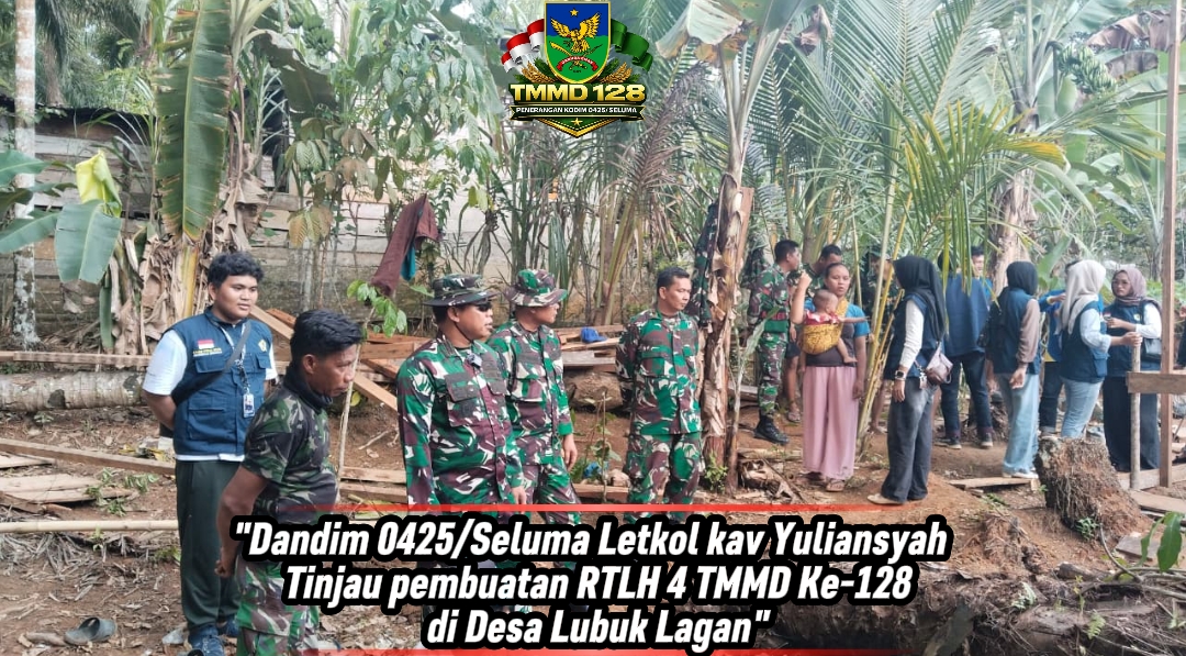 Seluma – Letkol Kav Yuliansyah selaku Komandan Kodim 0425/Seluma mengadakan inspeksi terkait pembangunan keempat Rumah Tidak Layak Huni (RTLH) dalam rangka program TNI Manunggal Membangun Desa (TMMD) Ke-128. Peninjauan di Desa Lubuk Lagan, Kecamatan Talo Kecil pada hari Selasa (28/04/2026) juga diwarnai dengan kehadiran mahasiswa Kuliah Kerja Nyata (KKN) Universitas Bengkulu (UNIB) kelompok 107 yang dipandu oleh Ir. Adhadi Kurniawan, S.T., M.Eng.