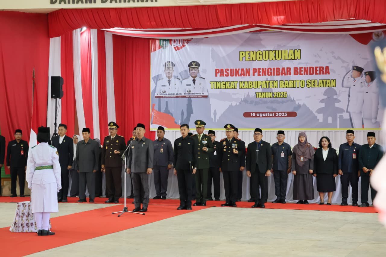 Barito Selatan – Dalam rangka mempersiapkan generasi muda yang tangguh dan penuh semangat kebangsaan, Kabupaten Barito Selatan menggelar Upacara Pengukuhan Pasukan Pengibar Bendera Pusaka (Paskibraka) Kabupaten Barito Selatan Tahun 2025, Bertempat di Gedung Jaro Pirarahan, Jalan Pahlawan, Kel.Buntok Kota Dusun Selatan, Kab.Barito Selatan, Prov Kalteng telah, Sabtu (16/08/2025).