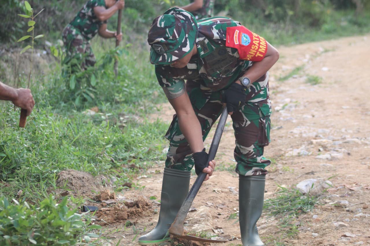 Di sela kegiatan, Dandim bersama Satgas dan warga juga melaksanakan penanaman pohon di area sekitar, sebagai bentuk kepedulian terhadap kelestarian lingkungan.