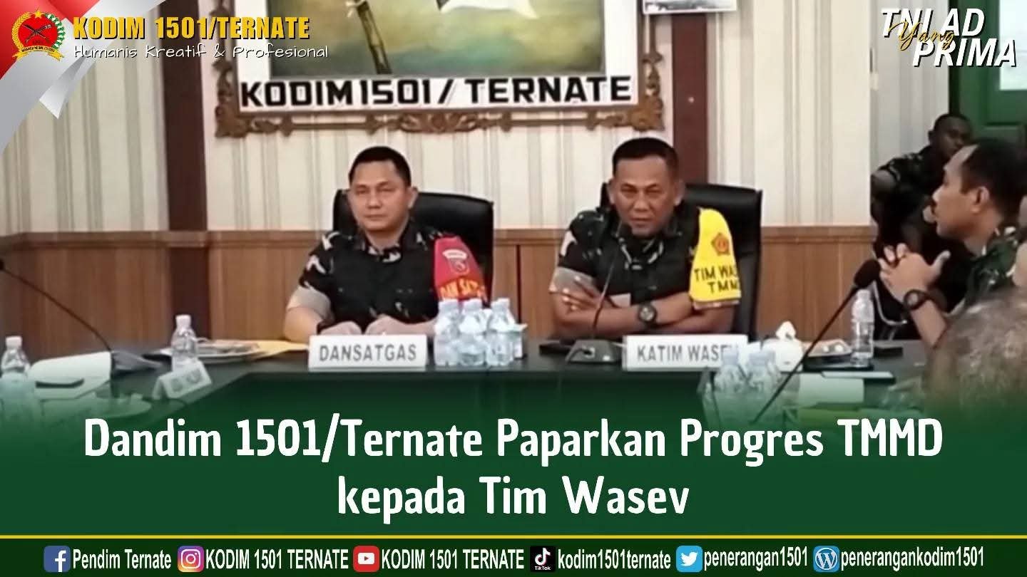 Kodim 1501/Ternate, Ternate – Dandim 1501/Ternate, Letkol Inf Jani Setiadi, memaparkan perkembangan pelaksanaan program TNI Manunggal Membangun Desa (TMMD) ke-124 tahun 2025 di wilayah Kodim 1501/Ternate kepada Tim Wasev di Makodim 1501/Ternate. Kamis (15/5/2025).