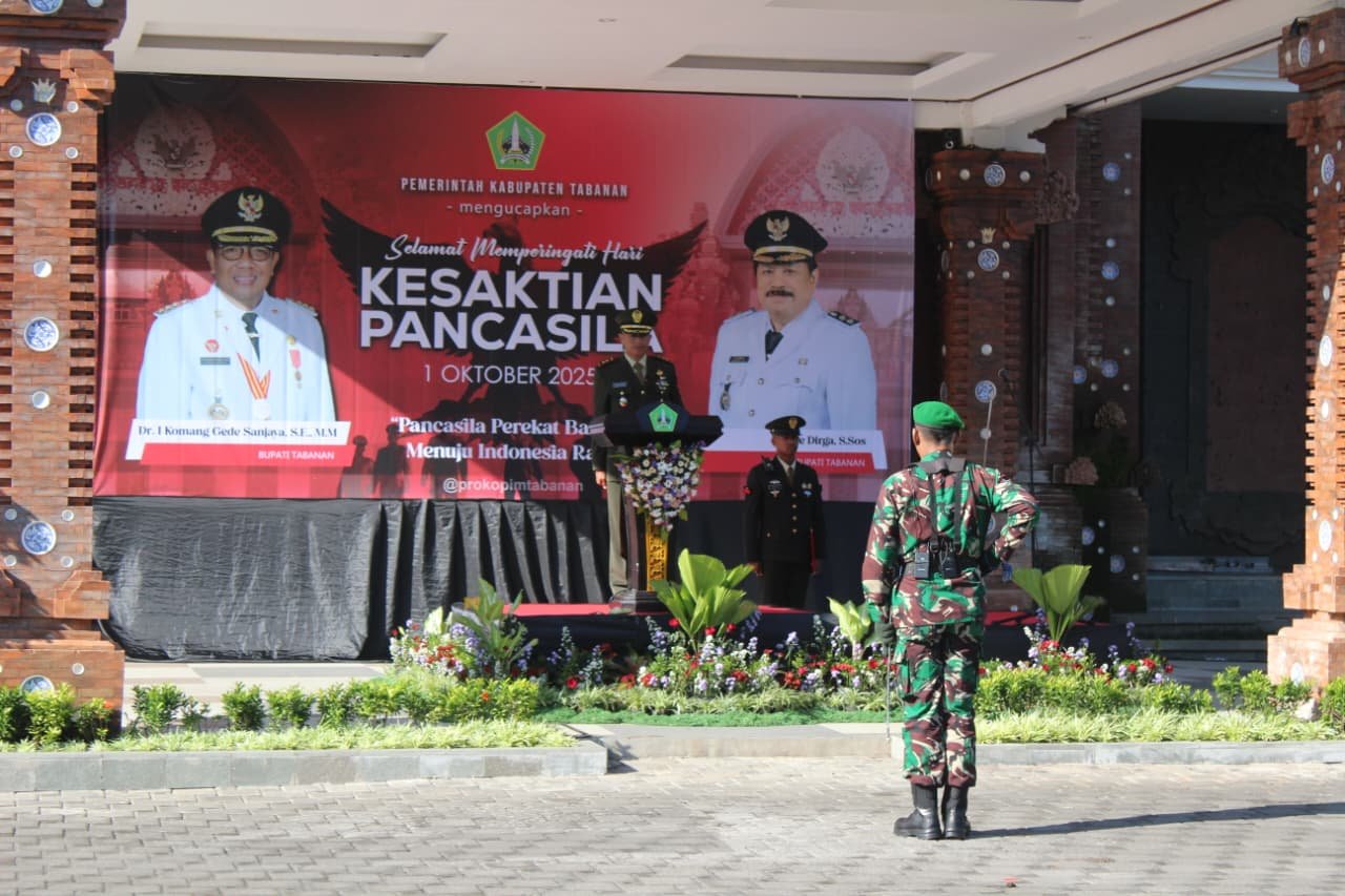 Tabanan – Dalam rangka memperingati Hari Kesaktian Pancasila yang jatuh pada 1 Oktober 2025, Pemerintah Daerah Kabupaten Tabanan menggelar upacara di halaman Kantor Bupati Tabanan, dengan Inspektur Upacara (Irup) Dandim 1619/Tabanan Letkol Inf Trijuang Danarjati, S.A.P., M.I.P., yang dihadiri oleh jajaran Forkopimda, ASN, TNI-Polri, pelajar serta organisasi masyarakat, Rabu (1/10/2025)